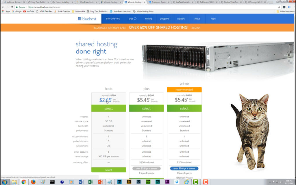 So you remember earlier when we talked about your domain name or your URL? Your URL is essentially just an easy to remember name for humans and every single URL resolves into an IP address. So every website has an IP address and in a lot of cases a lot of websites share the same IP address. So for example here’s GoDaddy.com; this particular IP address this, particular website right here which I am going to block out all the details and in post-production but I just wanted you to see here where there’s… there’s over 200000 other sites hosted on this server with this particular IP, this is GoDaddy. This is a shared blue host server, its step up- you’re sharing with 21, 00 other people. Here’s another example of hostmonster.com, hostmonster.com I am not exactly sure what this particular person purchased but there on a IP address with only 207 other sites. And if you look at my final option right here this is a company called Digital Ocean. Take a look at this IP address, this IP address only one other site it’s probably the same person. So this is probably an example of either a dedicated server or a VPS which is a virtual private server which essentially means that you’re leasing the server from the company. So in short I’m not overly enthusiastic about this particular company right here but I have had very good experiences and do host a lot of my sites with these guys right here on a VPS and I do have favorable things to say about BlueHost but please if you’re a real business and you and you care about your business don’t go with what I call the cat blog plan. Step up spend a little bit of money and like for example BlueHost right here is offering a teaser 14 bucks a month, it’s going to get you a dedicated IP and SSL certificate, domain privacy and site backup pro; all great things for a business to have. Now keep in mind it’ll be $24 next year. But still even 24 bucks that’s still pretty darn good pricing.